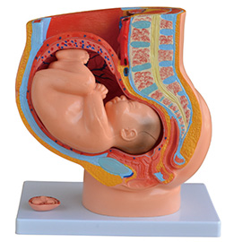 女性妊娠矢狀解剖模型展示了妊娠40周的女性骨盆矢狀切面,胎兒可取出供研究。顯示了胎兒出生前的正確胎位以及女性泌尿生殖系統(tǒng)等。