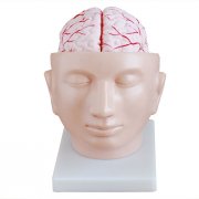 這款模型顯示顱內(nèi)的腦結(jié)構(gòu),顱基之上頭部可平行打開。腦模型可中分以顯示腦動脈和可拆卸腦底動脈。兩半都可分解為: 前頂葉、顳枕葉、腦干、小腦置于基架上。