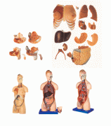 ■ 該模型由胸壁、胸腹腔內(nèi)臟器官以及男、女性生殖器官等20個部件組成,并顯示人體半身頭頸部軀干的顱腦,胸腹腔內(nèi)臟器官以及男、女兩性互換的生殖器官等結(jié)構(gòu),共有200個部位指示示標志。