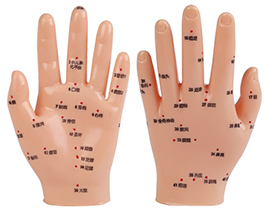 用PVC制成的左手模型,顯示手背上和手心穴位,穴位用漢字或數(shù)字標(biāo)注。