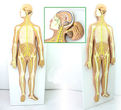 ■ 該模型顯示中樞神經(jīng)腦和脊髓、周圍神經(jīng)脊神經(jīng)等結(jié)構(gòu),包括從中樞發(fā)出到身體各部的脊神經(jīng)(臂從橈神經(jīng)、尺神經(jīng)、正中神經(jīng)、腰叢股神經(jīng)骶叢坐骨神經(jīng)等)等結(jié)構(gòu),共有33個部位指示標(biāo)志。